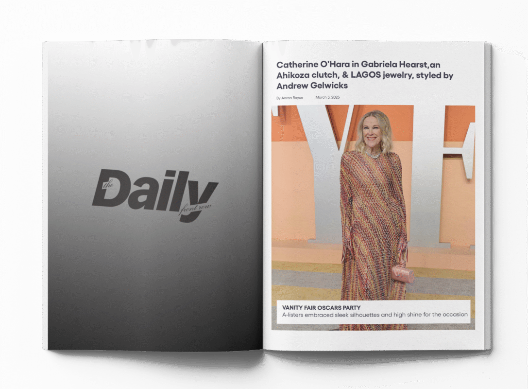 Catherine O'Hara in Gabriela Hearst, an Ahikoza clutch, & LAGOS jewelry, styled by Andrew Gelwicks